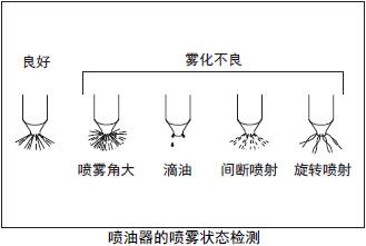 在噴油器試驗臺上調整壓力的同時,檢查噴孔堵塞、噴霧狀態(tài)以及噴孔內有無漏油現(xiàn)象等。噴霧不良時,清洗或更換噴油嘴。霧化檢測項目如下。筆直噴射。無大顆粒,微細噴霧。噴射后,噴孔無殘余油滴。