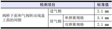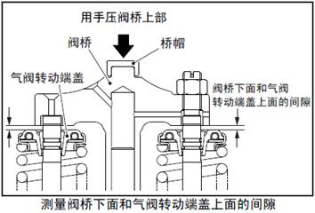 用手按壓閥橋,使和閥桿上端面接觸,檢測(cè)閥橋下面和三菱S6R柴油發(fā)動(dòng)機(jī)氣閥門轉(zhuǎn)動(dòng)端蓋上面的間隙。間隙超過標(biāo)準(zhǔn)值范圍時(shí),確認(rèn)故障的部件后更換新品。