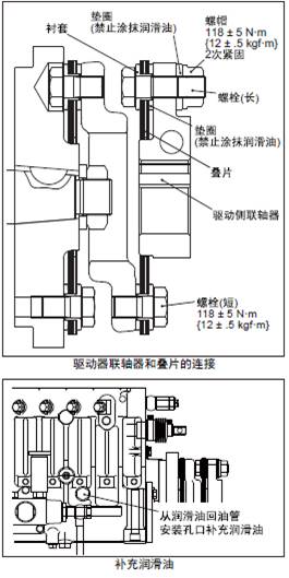 (b) 驅(qū)動(dòng)器聯(lián)軸器和疊片的接合面如有雜質(zhì)嵌入會(huì)引起打滑或損傷,使用前螺栓、襯套和墊圈要清洗干凈。