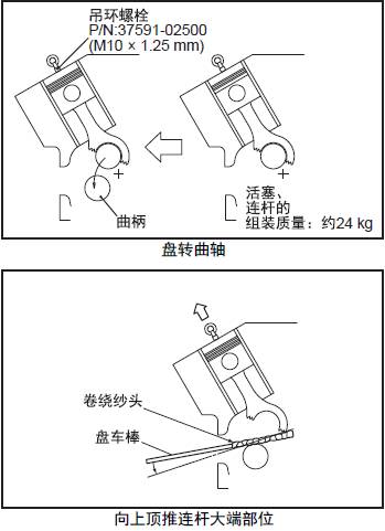 注: 用紗頭、橡膠等卷繞撬棒,避免損傷曲柄銷和三菱S12柴油發(fā)動(dòng)機(jī)連桿大端。