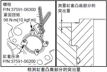 檢測(cè)要領(lǐng)參考「三菱S12柴油發(fā)動(dòng)機(jī)本體的組裝」的「檢測(cè)三菱S12柴油發(fā)動(dòng)機(jī)缸套凸肩部分的突出量」項(xiàng)。