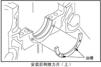 (1) 三菱S12柴油發動機推力片(上)的油槽面朝外側,對準三菱S12柴油發動機缸體最后端的定位銷后安裝。