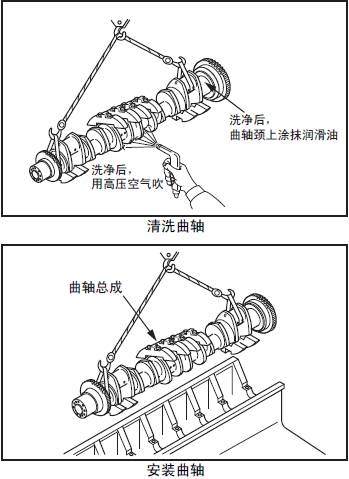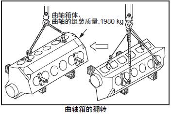 注: 起吊三菱S12柴油發動機曲軸時,為避免損傷三菱S12柴油發動機曲軸,用布吊帶或墊物進行起吊。