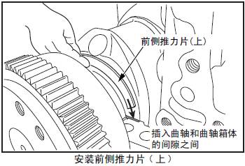 (2) 將前側三菱S12柴油發動機推力片(上)的油槽面朝向三菱S12柴油發動機前側,插入三菱S12柴油發動機曲軸和三菱S12柴油發動機缸體之間的間隙內。