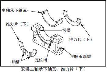 (3) 在最后端三菱S12柴油發動機主軸承瓦端蓋的定位銷位置安裝三菱S12柴油發動機推力片( 下)。