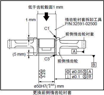 (2) 使用三菱R16柴油發(fā)動(dòng)機(jī)惰齒輪襯套拆卸工具的裝入端,從1mm 倒角的端面壓入,將前三菱R16柴油發(fā)動(dòng)機(jī)惰齒輪襯套壓入至齒輪轂的端面平齊。再用三菱R16柴油發(fā)動(dòng)機(jī)惰齒輪襯套拆卸工具的拆卸端,將襯套端面壓入至低于齒輪轂端面約1mm。
