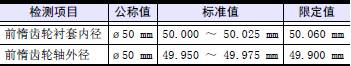 測(cè)量前三菱R16柴油發(fā)動(dòng)機(jī)惰齒輪襯套的內(nèi)徑和前三菱R16柴油發(fā)動(dòng)機(jī)惰齒輪軸的外徑。超過(guò)極限值時(shí),更換新的前三菱R16柴油發(fā)動(dòng)機(jī)惰齒輪總成或前三菱R16柴油發(fā)動(dòng)機(jī)惰齒輪軸。