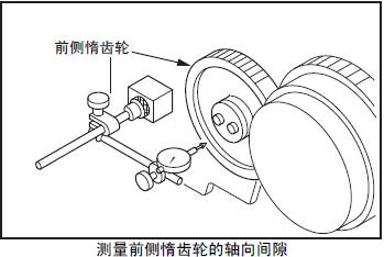 測量三菱R16柴油發動機前側三菱R16柴油發動機惰齒輪的軸向間隙。超過極限值時,更換新的三菱R16柴油發動機推力片或三菱R16柴油發動機惰齒輪。