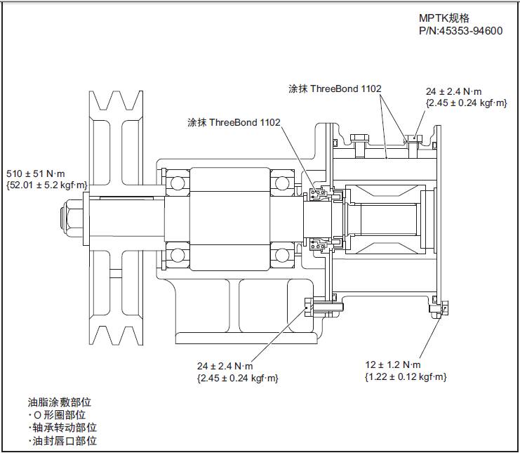 (1) 三菱S16柴油機皮帶輪側的球軸承回轉部分和三菱S16柴油機水泵泵體內充填WPH油脂( 協同油脂㈱生產)。