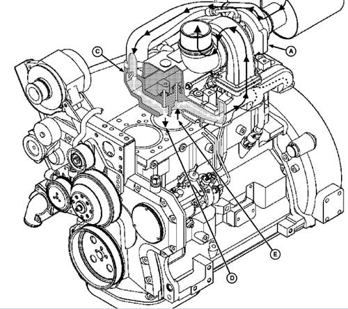 A—Turbocharger C—Intake Side of Cylinder D—Outside Intake Air E—Exhaust Air