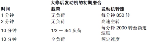 重要提示: 在磨合初期,定時檢查機油壓力和冷卻液溫度。還應該檢查燃油、機油或冷卻液是否有泄漏跡象。一次全負荷運轉時間不能超過 10 分鐘。