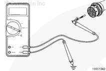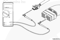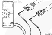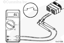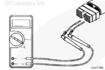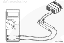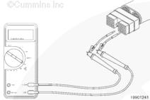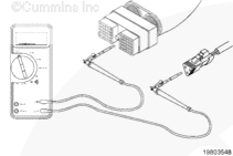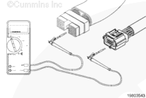 從康明斯電子控制模塊 (ECM) 上斷開原始設備制造商 (OEM) 線束接頭。將一根測試導線插入 OEM 線束接頭上的開關回路觸針,然后將鱷魚夾連接到萬用表表筆上。將另一根導線插入 OEM 線束接頭上的風扇控制開關信號觸針,然后將鱷魚夾連接到萬用表另一個表筆上。
