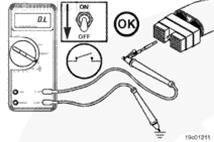 將開關置于 OFF(斷開)位置并測量電阻。萬用表必須顯示閉路(10 歐姆或更?。?。如果電路沒有閉合,則開關故障。關于更換步驟,參考 OEM 故障判斷和排除手冊。如果電阻值正確,必須檢查開關是否仍舊存在對地短路。
