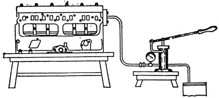 檢驗氣缸體和的裂紋,通常采用水壓試驗方法進行。檢驗時,用專用的蓋板將水道口密封。把水壓機水管接在氣缸體的進水口,然后將水壓入水套,要求在294~392kPa的壓力下保持5min,不應有滲透現(xiàn)象。如果沒有水壓試驗設備,也可以將汽油或煤油注入氣缸體和氣缸蓋水套內,經(jīng)半小時以后,檢視有無滲透現(xiàn)象。