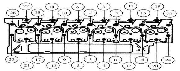 ①氣缸蓋安裝時,應(yīng)把標(biāo)有“缸體側(cè)”的一面朝向氣缸體,檢查水、油孔是否對齊。氣缸墊用過1次后不能再用。康明斯B系列發(fā)動機(jī)氣缸蓋螺栓的擰緊順序如下圖所示。