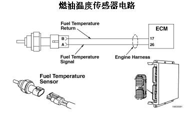 ECM 使用燃油溫度傳感器監測燃油溫度。ECM 監測觸針 26 上的電壓并將它轉換成溫度值。燃油溫度數值由 ECM 用于發動機保護系統。