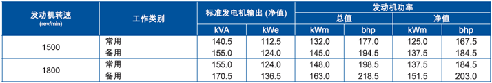 上表所有額定功率數(shù)據(jù)均為配備標準尺寸風(fēng)扃與驅(qū)動器比率的發(fā)動機,ISO/TR 14396/IS0 8528條件下操作時數(shù)據(jù)。有關(guān)上述條件以外操作的數(shù)據(jù)請咨詢珀金斯公司,Perkins提供的性能公差為±5%。電氣參數(shù)假設(shè)功率因數(shù)為0.8與發(fā)動機效率90%。