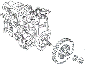 不要松開將噴油泵驅動齒輪固定在噴油泵輪轂上的四個螺栓。不要將驅動齒輪從輪轂上拆下來。準確的噴油泵正時幾乎很難達到。僅拆下驅動齒輪螺母和密封圈, 將輪轂留在齒輪上。