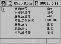2)燃油油位;3)機油壓力;4)液壓油溫;5)轉速;6)空氣濾清堵塞;7)預熱指示;8)充電及系統電壓指示;9)各種工作狀態等。