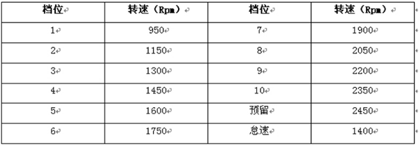 顯示當前油門檔位是1檔。隨著油門檔位增加,轉速作對應的增加,詳見如下表格。