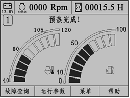 啟動開關打到預熱檔,發動機開始預熱,工作顯示界面提示“預熱進行中!”文字提醒。保持預熱15秒后,預熱完成,工作顯示界面提示“預熱完成!”文字提醒,如圖所示。