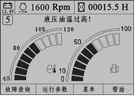 如果液壓油溫度達到85℃,約10秒鐘后,監控儀表提示“液壓油溫過高!”文字報警,監控儀表面板上液壓油油溫報警指示燈