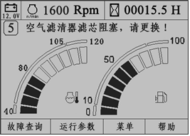 啟動發動機后,如果空氣濾清器堵塞,監控儀表提示“空氣濾清器濾芯阻塞,請更換!”文字報警,監控儀表面板上空濾報警指示燈