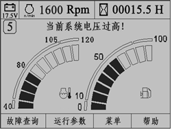 啟動發動機后,如果系統電壓值大于14.5V,監控儀表提示“當前系統電壓過高!”文字報警,同時蜂鳴器鳴叫。如果系統電壓值小于11.0V,監控儀表提示“當前系統電壓過低!”文字報警,同時蜂鳴器鳴叫,如圖所示。
