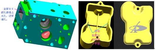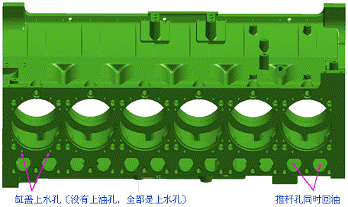 玉柴氣缸體-底面視圖:主油道通副油道的過渡由主軸承孔開槽來實(shí)現(xiàn),不必另外布置油道,結(jié)構(gòu)簡單。