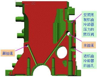 主、副油道鉆兩個(gè)斜孔,并通過主軸承孔連通,實(shí)現(xiàn)副油道供冷卻噴鉤的機(jī)油和潤滑油泵的機(jī)油。