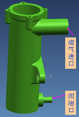 油氣有一定速度沿切線進(jìn)入油氣分離器并做旋轉(zhuǎn)運(yùn)動(dòng),在離心力的作用下,油滴被甩到分離器的壁上,由下面的回油孔回到油底殼油面以下