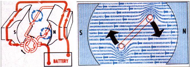 l 把電路環(huán)線(xiàn)置于兩磁極中。電流流向:蓄電池正→磁極線(xiàn)圈→ 碳刷→ 換向器→電路環(huán)線(xiàn) → 換向器→碳刷 →蓄電池負(fù)