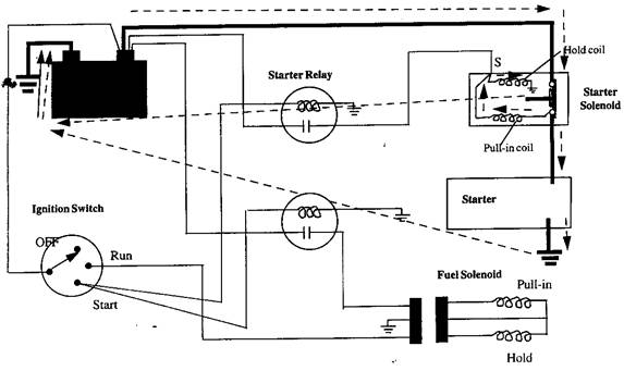 l 當(dāng)起動(dòng)開(kāi)關(guān)閉合時(shí),電路流經(jīng)電磁閥吸入線(xiàn)圈和保持線(xiàn)圈、磁場(chǎng)線(xiàn)圈和轉(zhuǎn)子線(xiàn)圈。