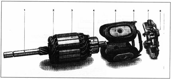 l 1、轉(zhuǎn)子軸 2、轉(zhuǎn)子線(xiàn)圈 3、轉(zhuǎn)子磁芯 4、換向器 5、磁極靴 6、磁場(chǎng)線(xiàn)圈 7、碳刷 8、碳刷架