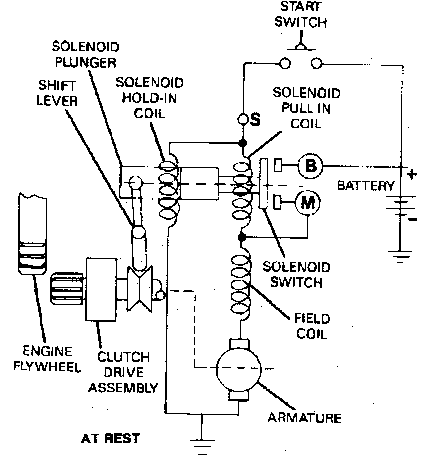 l 當(dāng)起動(dòng)開(kāi)關(guān)斷開(kāi)時(shí),電流瞬間(從M點(diǎn)到S點(diǎn)到電池負(fù))流過(guò)吸入線(xiàn)圈和保持線(xiàn)圈.