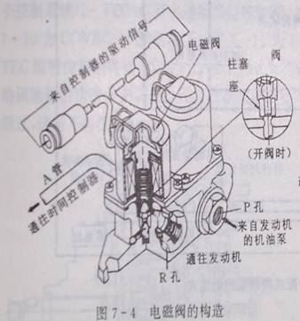 ECU控制電磁閥調節R孔的回流量從而控制控制A通往時間控制器的油壓控制調節活塞位置來實現噴油提前調節。