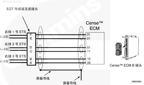 當鑰匙處于 ON(接通)或者康明斯發(fā)動機運轉(zhuǎn)時,可以使用 Insite™ 來監(jiān)測排氣溫度傳感器的溫度值以快速檢查電路圖工作情況。有三個傳感器連接到左排線束上的一個接頭。為了進行系統(tǒng)快速檢查,從有故障代碼的傳感器上斷開傳感器接頭。INSITE™ 讀取到的所有傳感器溫度,除了 9 號排氣溫度傳感器之外,都應(yīng)為非常低。如果斷開了與 7 號和 8 號排氣溫度傳感器相關(guān)的接頭,則 9 號排氣溫度傳感器讀取到的溫度值會非常高。短接每個傳感器的傳感器觸針“排氣溫度傳感器信號(正極)和排氣溫度傳感器信號(負極)”。Insite™ 中新的冷連接點處同一接頭上的傳感器的溫度讀數(shù)都將近似相同。這表示線束、熱電偶放大器和 CENSE™ ECM 正常工作,但傳感器有故障。如果接頭、線束、熱電偶放大器或者 CENSE™ ECM 有間歇性、故障或者腐蝕的連接,則有故障代碼的排氣溫度傳感器的溫度值響應(yīng)將不會如上所述。將需要對系統(tǒng)的其余部分進行故障診斷以確定有故障的部件。該過程假定同一個傳感器接頭上的所有三個傳感器都沒有故障代碼。