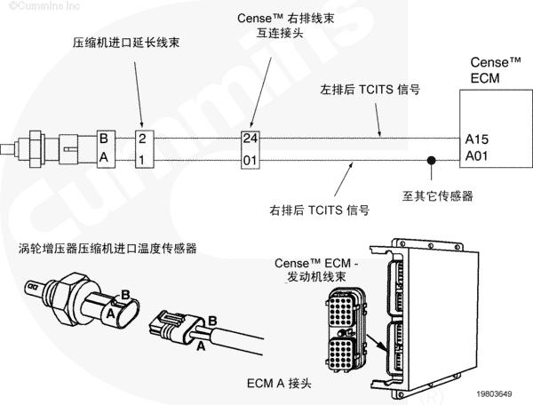 檢測到 CENSE™ 線束 ECM A 接頭的左排后渦輪增壓器壓縮機進口溫度傳感器電路圖信號觸針上電壓低。 |