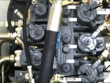 按下控制屏上“F3”鍵,把馬達轉(zhuǎn)速測量工裝吸到行走馬達上,把測線接到測試儀上,斜推 操縱桿,使左,右馬達分別正轉(zhuǎn),測轉(zhuǎn)速應(yīng)為12轉(zhuǎn)。使左右馬達分別反轉(zhuǎn),測轉(zhuǎn)速應(yīng)為12轉(zhuǎn)。若轉(zhuǎn)速達不到要求,則調(diào)節(jié)左右馬達控制閥塊螺釘,如下圖。