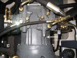 斷開回轉(zhuǎn)馬達制動油口,如下圖。在斷開的油管上接一測口,在斷開的馬達接頭處接堵頭。