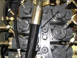 按下控制屏上“F3”鍵,快速回收鏟斗,讀出回油壓力,應(yīng)為90--100 bar,如果達不到,就調(diào)工作閥塊第二個黑六角螺釘,如下圖。