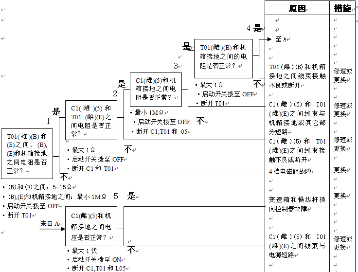 1)4檔電池閥故障 2)變速箱和操縱桿控制器C1(雌)-TL1(4)-T01(E)之間線束與電源短路,與機箱接地短路,觸點有故障或斷開 3)機箱-TL1(7)-T01(B)之間線束與機箱接地短路,觸點有故障或斷開 4)變速箱和操縱桿控制器有故障 | ||||