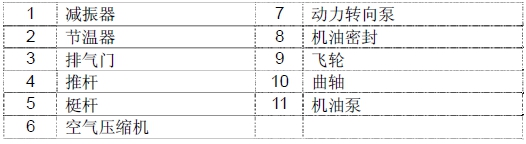 1 曲軸皮帶輪 2 機油濾清器 3 冷卻水泵皮帶輪 4 惰輪 5 冷卻水出口 6 燃油濾清器 7 空氣管 8 呼吸器 9 排氣歧管 10 安裝支架(后) (渦輪增壓器到中冷器) 11 飛輪殼 12 安裝支架(前) 13 油底殼 14 電氣控制裝置(ECU) 15 動力轉向泵 16 空氣壓縮機 17 渦輪增壓器 18 空氣管 19 空氣加熱器(空氣濾清器到渦輪增壓器) 20 空氣管 21 氣缸蓋罩 22 加油口蓋 23 冷卻水入口 24 起動機 25 機油冷卻器