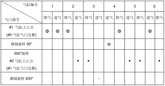 5) 當(dāng)5 號氣缸處于上止點時,根據(jù)列表中“●”調(diào)整氣門間隙 。