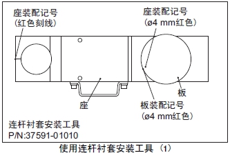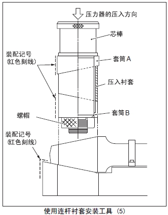 (2) 套筒A裝入心軸,套筒A的裝配記號(紅色刻線)對準(zhǔn)座臺(tái)的裝配記號(紅色刻線)后安裝在連桿襯套內(nèi)。