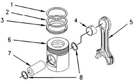 1.用一個合適的活塞環擴張器從活塞(6)上拆下活塞環(1)和(2)及控油環(3)。從連桿蓋上拆下連桿下軸瓦。從連桿上拆下連桿軸承上軸瓦。