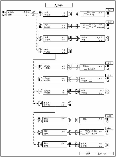 下一頁顯示了主功能和一些子功能的方框圖。如圖所示,主功能可進(jìn)一步分為四個(gè)子功能。如果需要顯示發(fā)動(dòng)機(jī)參數(shù),如機(jī)油壓力和機(jī)油溫度、水溫、發(fā)動(dòng)機(jī)轉(zhuǎn)速(RPM)和排煙溫度等,按顯示屏上“ENGINE”(發(fā)動(dòng)機(jī))附近的按鍵,參考本章“ENGINEMEMU”(發(fā)動(dòng)機(jī)功能)。