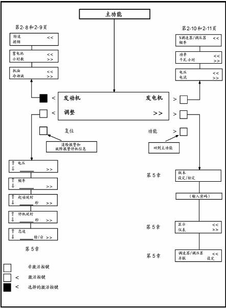 圖2-2給出了數(shù)字式顯示屏及其功能選擇鍵,請(qǐng)查閱前頁的“前端面板”關(guān)于功能顯示屏和按鍵的說明。當(dāng)不起動(dòng)發(fā)電機(jī)組在備用模式下操作和查看功能顯示屏?xí)r,按下然后釋放自我偵測鍵,這將會(huì)初始化PCC操作軟件,同時(shí)允許操作功能顯示面板,如果30秒內(nèi)沒有選擇任何功能,軟件定時(shí)器將會(huì)自動(dòng)切斷電源。在接電模式下,控制盤一直帶電,顯示屏一直處于工作狀態(tài)。
