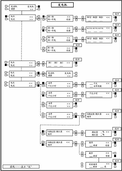 如果需要顯示發(fā)電機(jī)參數(shù),如電壓、電流、輸出功率(千瓦)和頻率,按顯示屏上“GEN”附近的按鍵,通過此功能分支還可以查看母排電壓、頻率和數(shù)字式同步信息。參考本章GENMENU(發(fā)電機(jī)功能)。如果需要調(diào)整輸出電壓、頻率或起動(dòng)和停機(jī)延時(shí)等,按顯示屏上“ADJUST”(調(diào)整)附近的按鍵,參考第5章“ADJUSTMENU”(調(diào)整功能)。