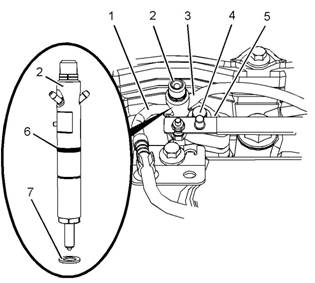 6拆下螺栓(4)。從噴油器(2)上卸下卡箍(5)。